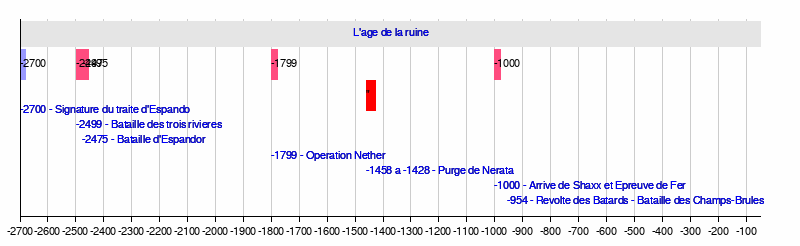 -954 - Revolte des Batards - Bataille des Champs-Brules-1000 - Arrive de Shaxx et Epreuve de Fer-1458 a -1428 - Purge de Nerata-1799 - Operation Nether-2475 - Bataille d'Espandor-2499 - Bataille des trois rivieres-2700 - Signature du traite d'EspandoL'age de la ruine