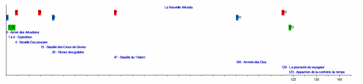123 - Apparition de la confrérie du temps120 - La poursuite du voyageur100 - Arrivée des Elus47 - Bataille du Trident20 - Retour des guildes15 - Bataille des Crocs de Givres4 - Bataille Eau pourpre1 à 4 - Expédition0 - Arrivé des ArkadiensLa Nouvelle Arkadia