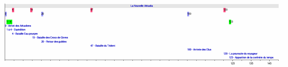 123 - Apparition de la confrérie du temps120 - La poursuite du voyageur100 - Arrivée des Elus47 - Bataille du Trident20 - Retour des guildes15 - Bataille des Crocs de Givres4 - Bataille Eau pourpre1 à 4 - Expédition0 - Arrivé des ArkadiensLa Nouvelle Arkadia