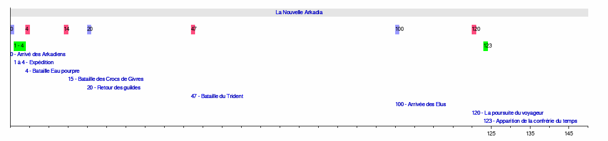 123 - Apparition de la confrérie du temps120 - La poursuite du voyageur100 - Arrivée des Elus47 - Bataille du Trident20 - Retour des guildes15 - Bataille des Crocs de Givres4 - Bataille Eau pourpre1 à 4 - Expédition0 - Arrivé des ArkadiensLa Nouvelle Arkadia