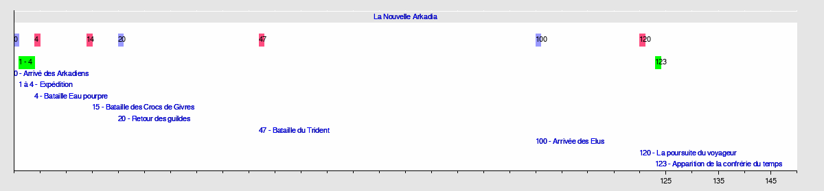123 - Apparition de la confrérie du temps120 - La poursuite du voyageur100 - Arrivée des Elus47 - Bataille du Trident20 - Retour des guildes15 - Bataille des Crocs de Givres4 - Bataille Eau pourpre1 à 4 - Expédition0 - Arrivé des ArkadiensLa Nouvelle Arkadia